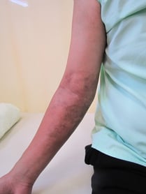 以前この患者さんは反対の手首を骨折しましたが、整形外科で約一か月ギプスで固定され痒さと臭さで苦労したそうです。当院では毎回固定を外し皮膚の消毒 浮腫の除去に努めるので楽に生活できます。