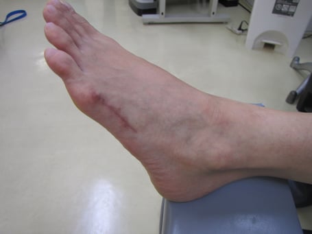 当初は足部は浮腫と血行障害によりどす黒く足背部の血管も見えませんでした。手術傷口も紫色に膨らんだ瘢痕を残していましたが、マッサージを施し徐々に血色もよくなりきれいになりました。